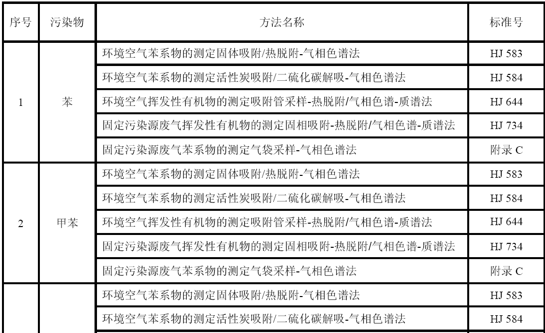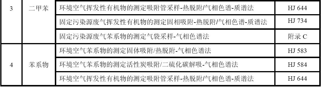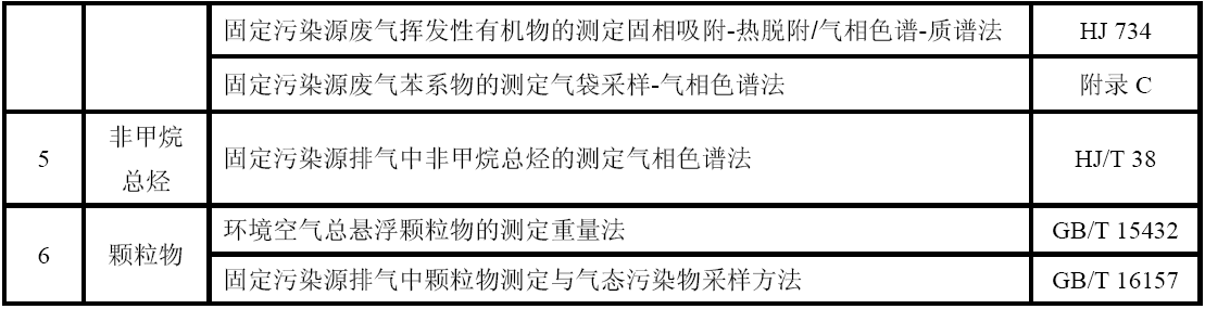 GB 16297 大氣污染物綜合排放標準 GB 24409 汽車涂料中有害物質限量 GB/T 15089 機動車輛及掛車分類 GB/T15432 環境空氣總懸浮顆粒物的測定重量法 GB/T 16157 固定污染源排氣中顆粒物測定與氣態污染物采樣方法 HJ 583  環境空氣苯系物的測定固體吸附/熱脫附-氣相色譜法 HJ 584   環境空氣苯系物的測定活性炭吸附/二硫化碳解吸-氣相色譜法 HJ 644      環境空氣揮發性有機物的測定吸附管采樣-熱脫附/氣相色譜-質譜法 HJ 732  固定污染源廢氣揮發性有機物的采樣氣袋法 HJ 734  固定污染源廢氣揮發性有機物的測定固相吸附-熱脫附/氣相色譜-質譜法 HJ/T 38  固定污染源排氣中非甲烷總烴的測定氣相色譜法 HJ/T 55  大氣污染物無組織排放監測技術導則 HJ/T 75   固定污染源煙氣排放連續監測技術規范(試行) HJ/T 194  環境空氣質量手工監測技術規范 HJ/T 293  清潔生產標準汽車制造業(涂裝) HJ/T 397  固定源廢氣監測技術規范 《建設項目環境保護設施竣工驗收監測技術要求(試行)》(環發(2000)38號)