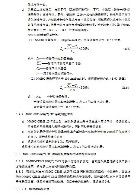 9.3.2.1非甲烷總烴技術指標要求見本標準表1,操作步驟和計算公式按照HJ1013中7.2現場檢測要求和方法及本標準附錄B相關要求執行。準確度驗收時,待測NMHC-CEMS與參比方法同步對現場排放非甲烷總烴進行測量。參比方法可選用HJ38,也可選用國家制訂發布的其它非甲烷總烴測試方法標準。